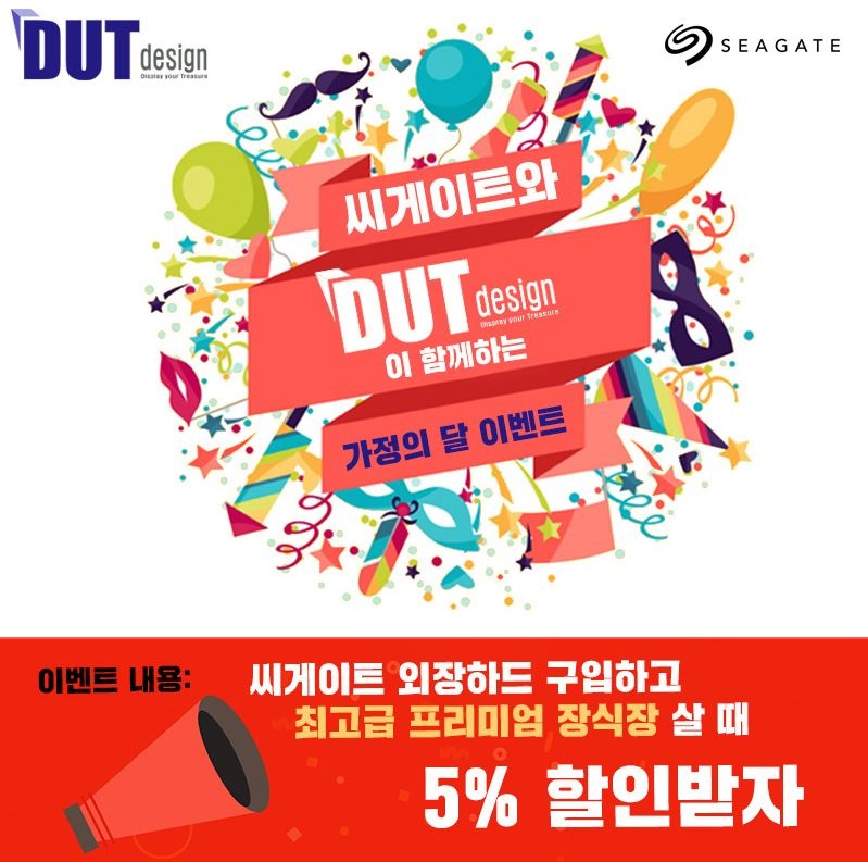 두트 디자인, DUT design, 디스플레이 장식장, 진열장, 제조 판매, 가정의 달, 5월 맞이, 스토리지 전문기업, 씨게이트, Seagate, 라씨, Lacie, 외장하드, 전 라인업, 구매 고객 대상, 두트디자인 장식장 전 품목, 아크릴 품목 제외, 5%, 모바일 할인 쿠폰 증정, 이벤트, 진행,