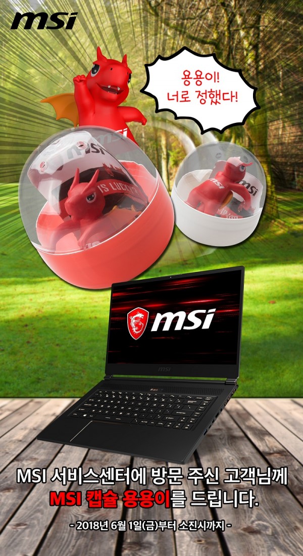 이번 행사는 2018년 6월 1일 (금)부터 소진 시까지 진행되며, MSI 노트북 및 볼텍스 공식 서비스센터(서울 용산구 청파로 112 나진상가 15동 2층 203호)에 방문 및 서비스를 받으시는 모든 MSI 고객분들께 ‘MSI 캡슐용용이’ 미니피규어가 1:1로 증정된다.