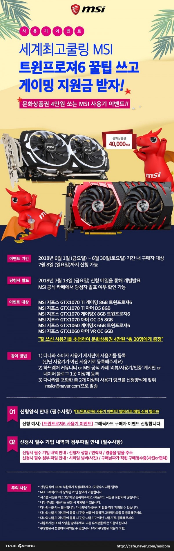 기간 내 대상 그래픽카드를 구매한 고객들은 7월 13일 금요일까지 자신만의 사용기를 작성하면 추첨하여 경품이 증정된다. 사용기는 다나와 소비자 사용기 게시판과 활동하는 하드웨어 커뮤니티나 MSI 공식 카페 사용기 게시판 혹은 개인 네이버 블로그 중 1곳 이상에 등록하고 다나와 사용기를 포함한 2개 이상의 링크들과 함께 ‘성함 / 연락처 / 경품을 받을 주소 / 제품 시리얼 넘버(사진) / 구매날짜가 적힌 구매영수증(사진 or 캡쳐본)’을 이벤트 메일로 발송하면 된다. 메일을 보낸 참여자 중 추첨하여 총 20명을 선정, ‘문화상품권 4만원’이 기프티콘으로 발송될 예정이다. 당첨자는 개별 연락하여 발표할 예정이다.