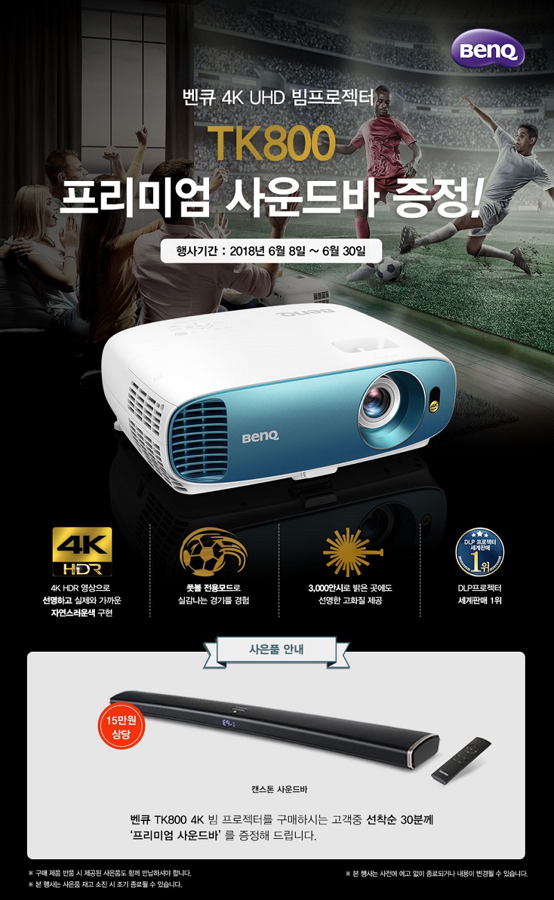 벤큐 프로젝터 PM 조정환 팀장은 “벤큐 TK800 프로젝터는 월드컵 시즌을 맞아 4K 영상으로 경기를 관람하고 싶은 스포츠 마니아 고객을 위해 야심 차게 출시한 모델로 출시 후 완판을 기념해 다시 한번 진행하는 이벤트”라며, 이벤트 기획 의도를 밝혔다. 이번 이벤트는 TK800 프로젝터 구매자 선착순 30명에게 15만원 상당의 캔스톤 프리미엄 사운드 바를 증정하는 행사다.