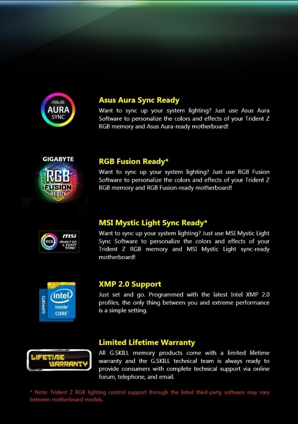 이번 지원으로 지스킬(G.SKILL)사의 트라이던트 Z RGB(TRIDENT Z RGB) 시리즈는 RGB 조명 기술을 제공하는 메인보드 상에서 장착 후 메인보드의 LED 색상 및 LED 효과를 동기화 하여 맞춤 설정을 할 수 있으며, 통일된 효과를 통해서 최상의 튜닝 효과를 보여주며, 이 외 RGB 조명 기술을 제공하지 않는 다른 브랜드의 메인보드에서도 화려한 RGB효과를 즐길 수 있도록 자체 소프트웨어를 제공, 사용자가 원하는 컬러의 튜닝 PC 구성과 화려한 효과를 어느 환경에서도 즐길 수 있도록 편의를 제공 하는 완벽한 RGB 임펙트 제공 DDR4 시리즈로 불릴 수 있게 되었다.