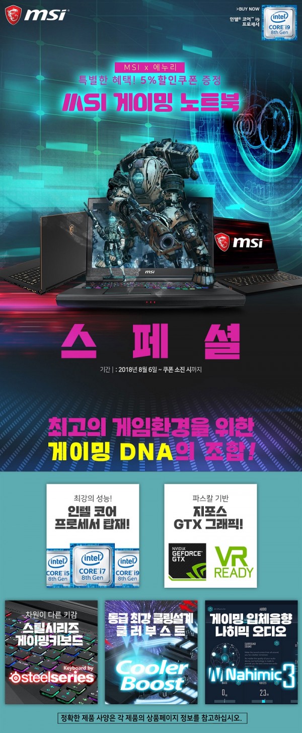‘MSI 게이밍 노트북’을 비롯한 행사 대상 제품들은 인텔 코어/제온 프로세서와 엔비디아 파스칼 기반 지포스/쿼드로 그래픽을 기본 탑재했다. 또 MSI만의 독보적인 쿨링 기술인 ‘쿨러 부스트’ 설계가 적용돼 내부 발열을 신속하게 배출하고 장시간 구동에도 PC의 안정성을 유지하도록 돕는다.