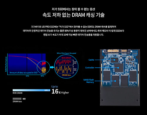 기가바이트 UD PRO SSD는 도시바 3D 낸드 플래쉬를 탑재하여 더욱 빨라진 속도와, 높아진 안정성을 가진 제품이다. 특히 저가 SSD에서는 볼수 없는 DRAM 캐쉬를 탑재하여 스토리지의 공간이 부족한 상황에서도 속도 저하 없이 꾸준하게 안정적인 작동이 가능하다.