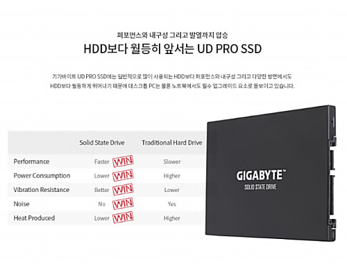 또한, 기가바이트 UD PRO SSD는 HDD보다 월등히 앞서는 퍼포먼스와 내구성을 가지고 있다. 특히 HDD 보다 더욱 빠른 속도(R:530MB/s W:500MB/s)를 가지고 있어 부팅과 로딩은 물론 데이터 전송시에도 높은 속도를 자랑한다. 그리고 SSD(Solid State Drive) 답게 낮은 소비전력과 발열, 무소음-무진동이라는 특징가지고 있어 노트북은 물론 미니 PC와도 뛰어난 조합을 자랑한다.