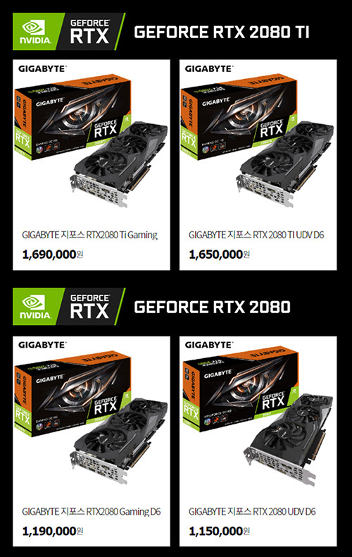 이러한 튜링 아키텍처 GPU가 탑재된 GIGABYTE 지포스 RTX 2080 Ti, RTX 2080 그래픽카드는 각각 친숙한 Gaming과 윈드포스 시리즈로 칩셋별 2종씩 총 4개의 제품을 11번가 사전 예약 판매 이벤트 (한정수량)에 선보이고 있으며, 구입을 위해서는 11번가 메인화면에 보이는 배너섹션 중 스페셜라이프, 엔비디아 예판 코너를 통해 찾아볼 수 있다.