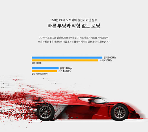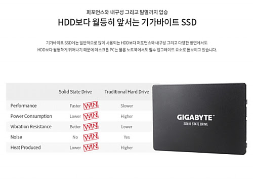 기가바이트 SSD 240GB는 HDD보다 월등히 앞서는 퍼포먼스와 내구성을 가지고 있다. 특히 HDD 보다 더욱 빠른 속도(R:500MB/s W:400MB/s)를 가지고 있어 부팅과 로딩은 물론 데이터 전송시에도 높은 속도를 제공하여 다양한 환경의 컴퓨터와도 어울린다.