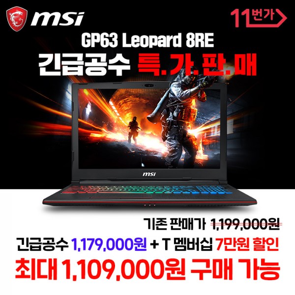 이번 특가 판매는 2019년 3월 7일 단 하루 동안 한정으로 진행되며, 11번가 판매 페이지에서 MSI GP63 Leopard 8RE 게이밍 노트북 구매 시 긴급 공수 특가에 T멤버십 7만 원 할인까지 최대 9만 원 할인된 가격으로 구매할 수 있다.