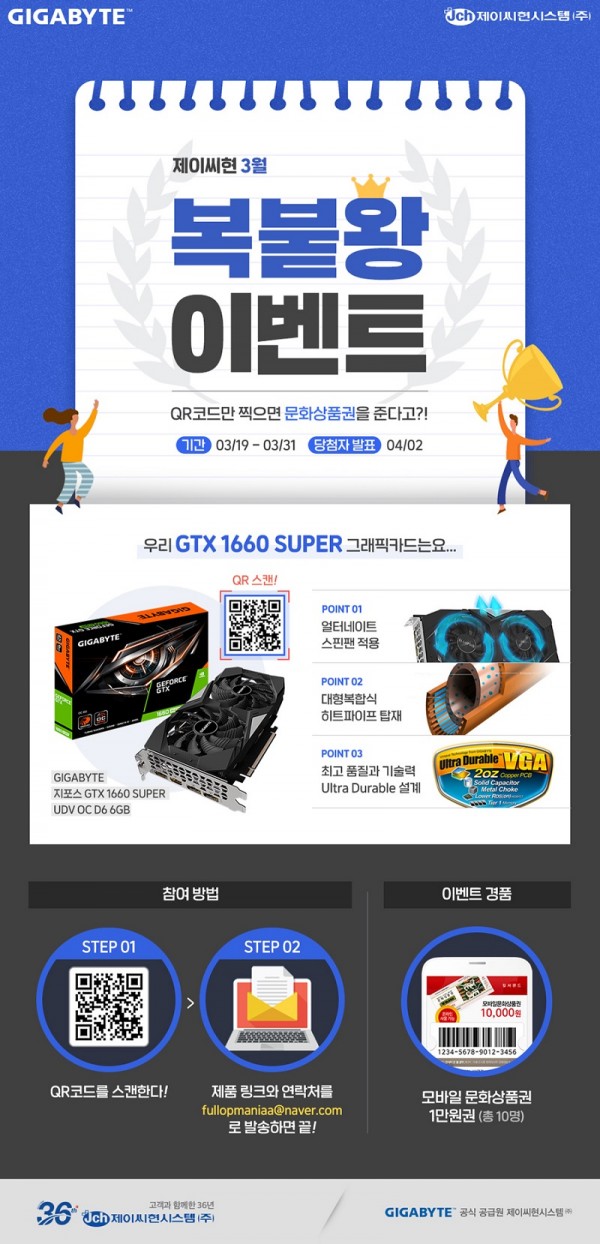 GIGABYTE Technology Co., LTD (이하 기가바이트)의 공식 공급원인 제이씨현시스템㈜ (대표: 차현배)에서는 2020년 3월 19일(목)부터 3월 31일(화)까지, 메인보드에 이어 제이씨현시스템 3월 복붙왕 이벤트 2탄 : GIGABYTE 그래픽카드 편(GTX 1660 SUPER) 을 진행한다.