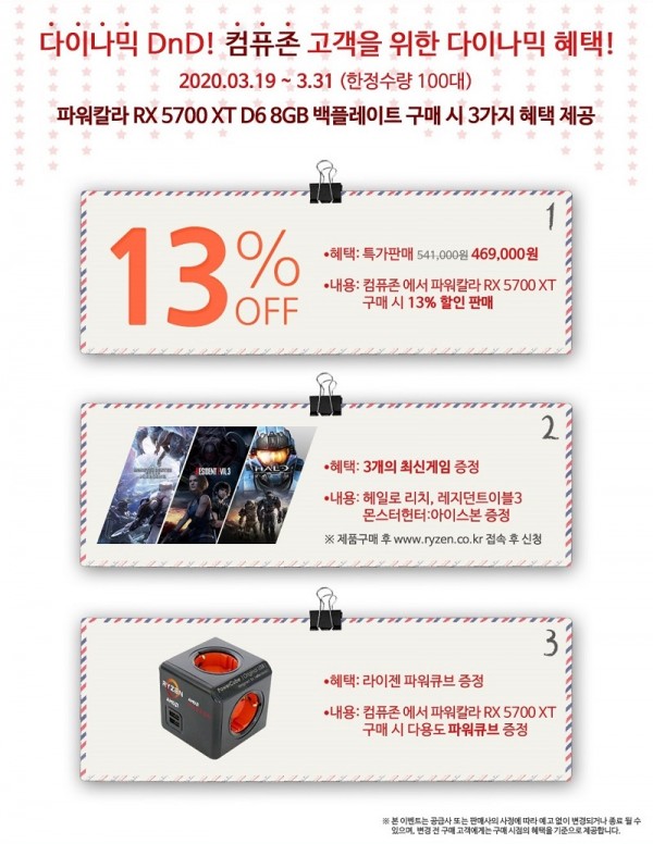 본 프로모션은 PC전문 온라인몰인 컴퓨존에서 3월 20일부터 말일까지 한정 수량 100대로 진행되며, 라데온 RX 5700 XT를 구매를 고려하고 있는 게이머 또는 증정되는 3개의 게임을 플레이하고자 하는 고객에게 가장 좋은 기회가 될 것이다.
