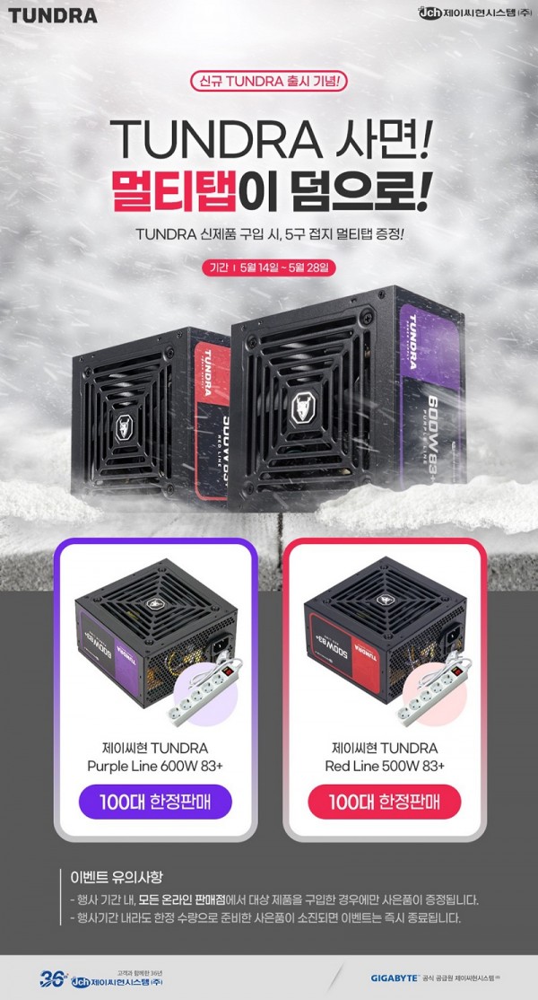 행사 대상 제품은 TUNDRA 파워서플라이 700W에 이어 새롭게 출시한 제이씨현 TUNDRA Purple Line 600W, Red Line 500W로 풀-로드 시 최대 83% 효율을 제공하며 정격 600W & 500W의 안정적인 출력과 동시에 Double Forwarding 설계로 한층 더 안정성이 획기적으로 향상된 제품이다.