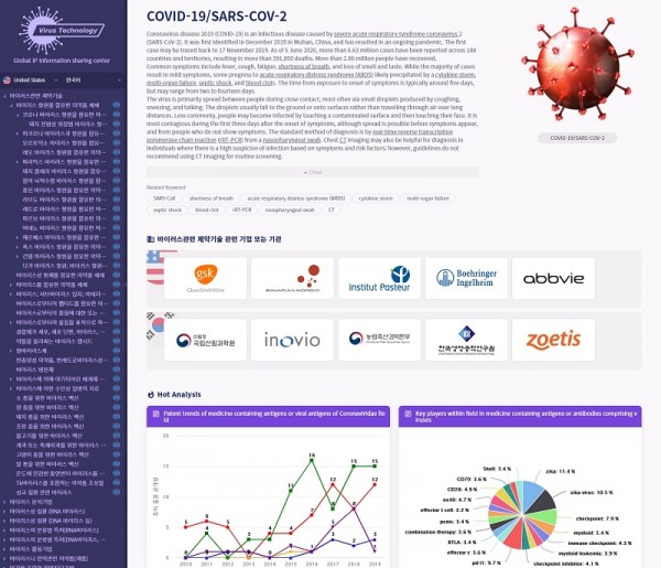 특허 정보 공유 센터는 1000종 이상으로 분류된 바이러스 기술과 10만개가 넘는 관련 키워드에 대한 한국, 미국, 유럽, 중국, 일본 내 35만여건의 특허를 분석해 국가별 동향, 기업, 기술, 연구자, 이벤트 및 특허 콘텐츠를 시각화해 제공한다. 언어는 한국어, 영어가 지원된다.