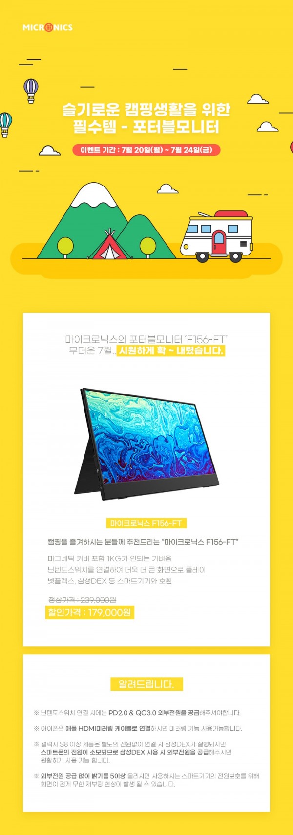 이번에 준비한 마이크로닉스의 포터블모니터 특가 이벤트는 요즘 캠핑과 차박을 즐기는 20~30대 분들이 늘어나는 추세로 캠핑 시 넷플렉스, 닌텐도스위치 등의 스마트 기기와 연결하여 큰 화면으로 즐길 수 있도록 준비 된 여름 맞이 특가 이벤트이다.