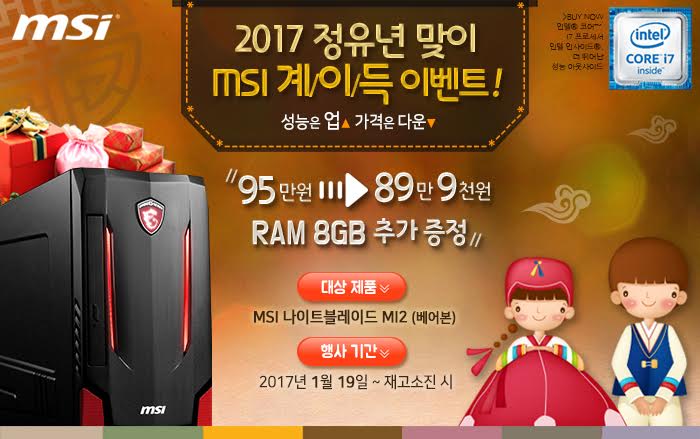 (주)엠에스아이코리아, 엠에스아이, MSI, MSI Korea, 2017, 정유년, MSI 나이트블레이드 MI2 베어본, 구매, 특별할인, 메모리, 8GB, 증정, 이벤트, 진행,