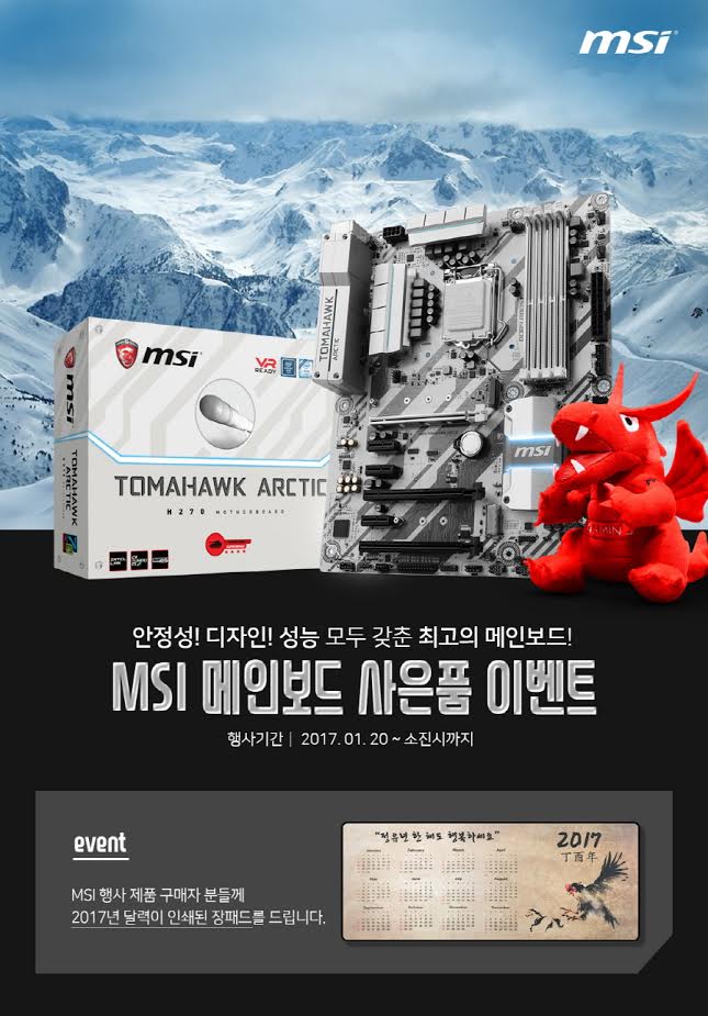 이번 이벤트는 2017년 1월 20일 (금)부터 경품 소진 시까지 판매점을 통해 진행하며, 이벤트 안내가 되어있는 판매점을 통해 내 MSI의 카비레이크용 ‘Z270 / H270 / B250’ 칩셋을 사용하는 메인보드(MSI B250M 박격포, MSI B250M 박격포 아틱 제외)를 구매하는 고객에게 2017 정유년 달력 장패드가 1:1로 증정된다.