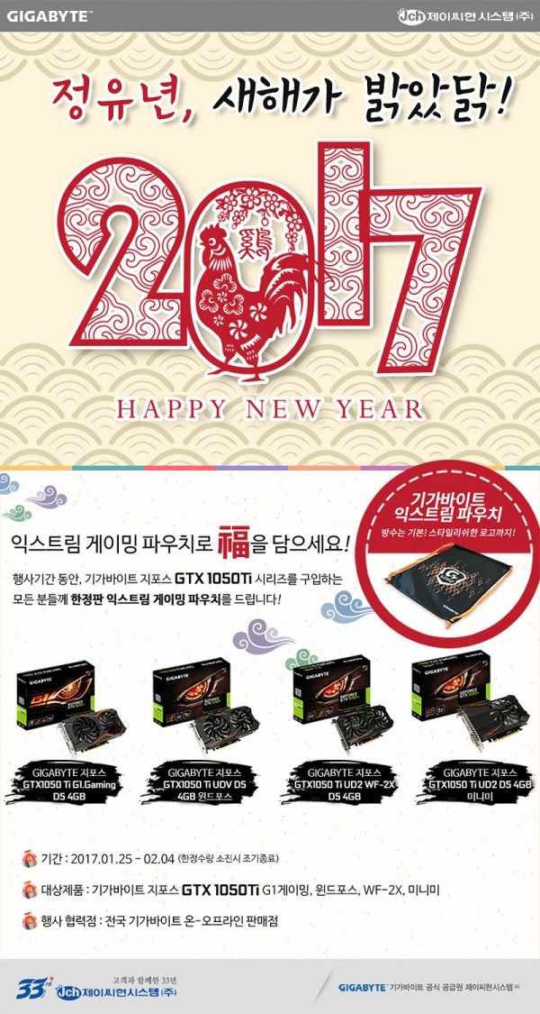 GIGABYTE Technology Co., LTD (이하 기가바이트)의 공식 공급원인 제이씨현시스템㈜ (대표: 차현배)에서는 2017년 1월 25일(수) 부터 엔비디아의 최신 파스칼 아키텍쳐를 탑재한 GIGABYTE 지포스 GTX1050 Ti 시리즈 그래픽카드 구매고객에게 한정판 익스트림 게이밍 파우치를 증정하는 이벤트를 진행하고 있다고 밝혔다.