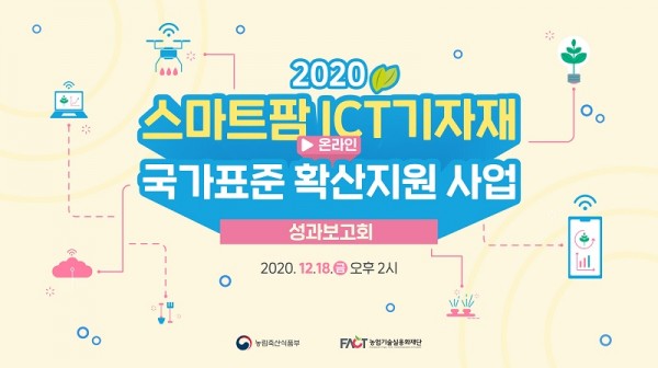 농림축산식품부(장관 김현수), 농업기술실용화재단(이사장 박철웅)이 준비한 ‘2020 스마트팜 ICT기자재 국가표준 확산지원 사업 성과보고회’가 12월 18일 오후 2시 온라인으로 개최한다.