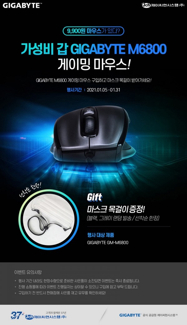 GIGABYTE Technology Co., LTD (이하 기가바이트)의 공식 공급원인 제이씨현시스템㈜ (대표: 차현배,차중석)는 2021년 1월 5일(화)부터 1월 31일(일)까지, GIGABYTE GM-M6800 게이밍 마우스를 구매한 고객을 대상으로 마스크 목걸이를 사은품으로 증정한다.