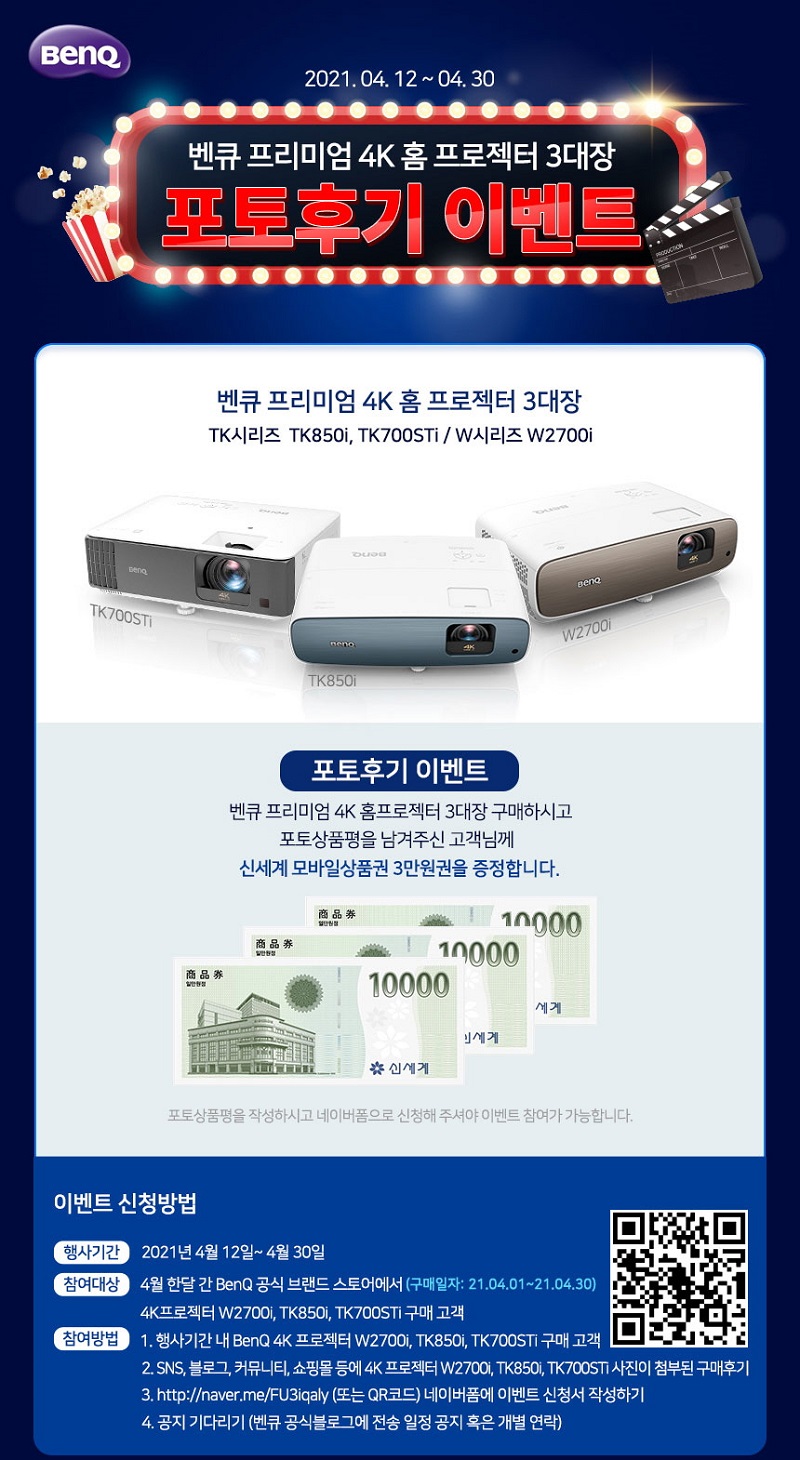이번 포토후기 이벤트는 4월 한 달 간 벤큐 4K 스마트 홈 프로젝터 시리즈 라인업 3종(W2700i, TK850i, TK700STi)을 구매한 고객과 4월 15일부터 5월 15일까지 LED 스탠드(WIT 스탠드, WIT 스탠드 지니), 모니터조명(스크린바 플러스, 스크린바)을 구매한 고객을 대상으로 한다. 구매 후 사진이 포함된 구매 후기를 작성하고, 네이버 폼을 통하여 신청하면 이벤트 지원이 완료된다. 지원한 모든 인원을 대상으로 구매한 제품에 따라 각각 신세계 모바일 문화상품권 3만원권(프로젝터 구매 고객), 모바일 문화상품권 1만원권(LED 스탠드 구매 고객)을 사은품으로 증정한다. 4K 프로젝터 3종과 시력보호 모니터조명 스크린바, 스크린바 플러스 모델의 경우 벤큐 브랜드 스토어를 통하여 이벤트 참여가 가능하다.