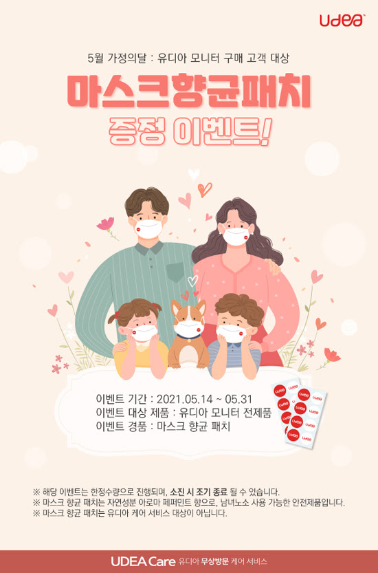 4월 12일부터 실내 마스크 착용이 의무화가 되어 장시간 마스크 착용 시 답답할 수 있어 이를 해소시킬 수 있는 향균 마스크 패치를 제공하여 모든 고객이 상쾌하게 하루를 보낼 수 있도록 프로모션을 진행한다. 명실상부 No.1 국민모니터 유디아에서는 항상 깨끗하게 모니터를 사용하고자 하는 소비자들에게 보다 쾌적한 환경을 제공해드리고자, 해당 프로모션을 기획했다고 밝혔다.