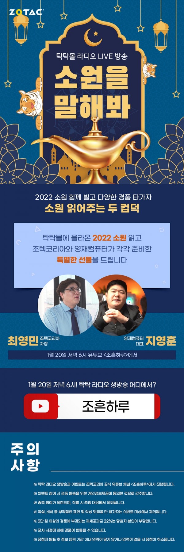 조텍, 조텍코리아, ZOTAC, ZOTAC Korea, 공식 쇼핑몰, 탁탁몰, 신년 소원 공유, 특별한 경품 선물, 탁탁 2022 소원을 말해봐 LIVE, 1월 20일, 저녁 6시, 조텍 유튜브 채널, 조흔하루, 방송