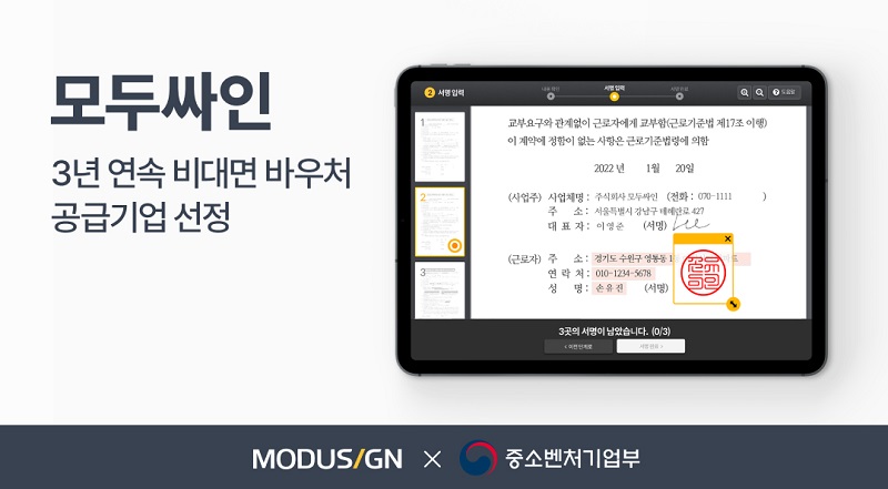 국내 1위 전자계약 서비스 모두싸인(대표 이영준)이 중소벤처기업부 주관 ‘K-비대면 서비스 바우처 지원사업’ 공급기업으로 3년 연속 선정됐다고 24일 밝혔다.