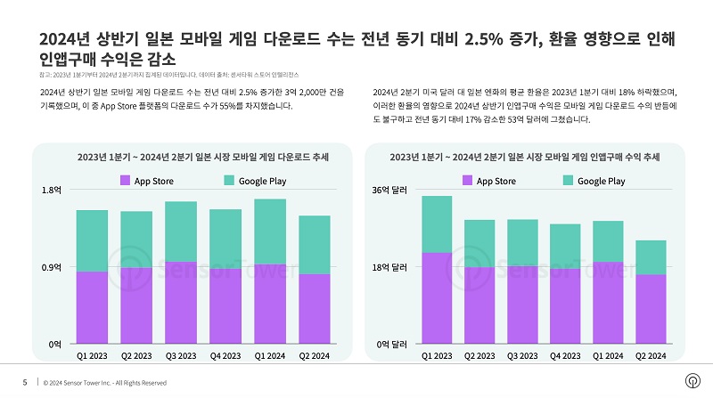 2024년 상반기 일본 모바일 게임 다운로드 수는 전년 대비 2.5% 증가한 3억2000만 건을 기록했으며, 이중 앱스토어(App Store) 플랫폼의 다운로드 수가 55%를 차지했다. 2024년 2분기 미국 달러 대 일본 엔화의 평균 환율은 2023년 1분기 대비 18% 하락했으며, 이러한 환율의 영향으로 2024년 상반기 인앱 구매 수익은 모바일 게임 다운로드 수의 반등에도 불구하고 전년 동기 대비 17% 감소한 53억달러에 그쳤다.