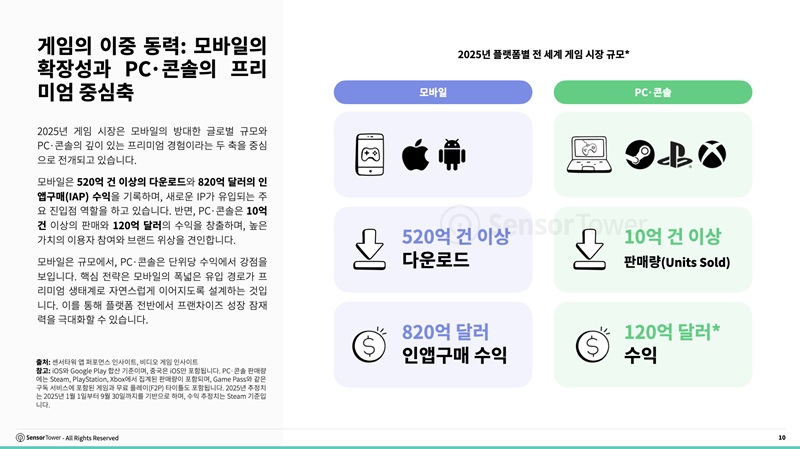 2025년 글로벌 게임 시장은 여전히 모바일을 중심으로 한 대규모 유입 전략과 PC·콘솔을 통한 프리미엄 수익 전략이 병행되고 있다. 모바일은 연간 520억 건 이상의 다운로드와 820억달러의 인앱구매(IAP) 수익을 기록하며 새로운 IP 유입의 핵심 진입점 역할을 한다. 반면 PC·콘솔은 10억 건 이상의 판매량과 120억달러의 수익을 창출하며, 높은 단위당 수익과 브랜드 가치를 기반으로 견고한 프리미엄 생태계를 형성하고 있다.