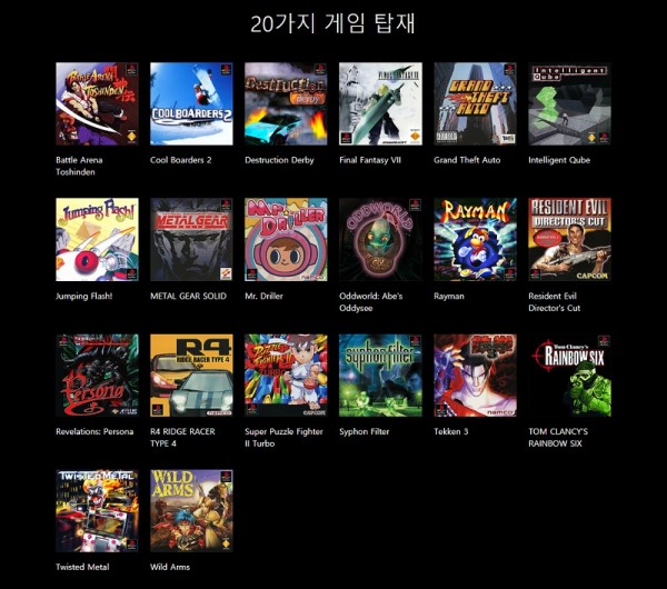 일본 버전 한정으로 아머드 코어, 아크 더 래드, 아크더 래드 2, G 다라이어스, xi(사이), 그라디우스 외전, 사가 프론티어, 패러사이트 이브 등 8종, 글로벌 버전 한정으로는 GTA, Oddworld: Abe’s Oddysee, 디스트럭션 더비, 레이맨, 레인보우 식스, 사이폰 필터, 쿨 보더즈 2, 트위스티드 메탈 등 8종이다. 한국은 글로벌 버전으로 20종의 게임이 제공된다.