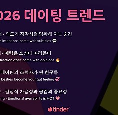 틴더(Tinder)가 올해 전 세계 틴더 이용자들 사이에서 가장 주목할 만한 데이팅 트렌드를 조명한 연말결산 ‘2025 Year in Swipe™’를 발표했다.‘Year in Swipe’는 틴더 데이터를 기반으로 앱 내 인기 관심사와 MBTI, ‘패스포트’ 기능으로 가장 많이 방문하는 나라 등 한 해 동안의 연애 및 데이트 관련 다양한 이용자 트렌드를 살펴…