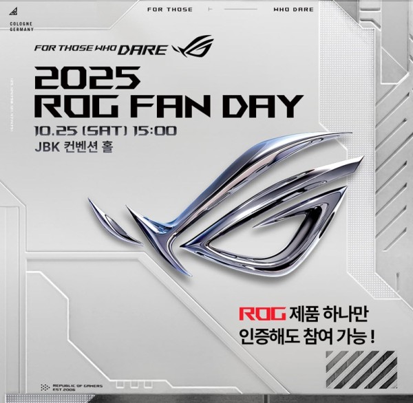 ROG FAN DAY 2025는 에이수스 그래픽카드 30주년을 기념하고 ROG를 사랑하는 유저들과의 만남을 위해 마련된 자리로 10월 25일 오후 3시, 서울 JBK 컨벤션 홀에서 진행된다. ROG의 다양한 하드웨어와 더불어 신제품 전시 및 체험 그리고 다양한 이벤트와 경품이 제공될 예정으로 참가 신청은 에이수스 공식 홈페이지 및 ASUS · ROG SNS채널을 통해 가능하다.