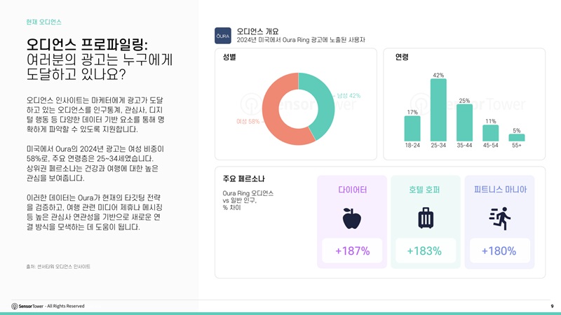 예를 들어 스마트 링 브랜드인 오우라(Oura)의 경우 여성 비중이 58%였으며, 주요 연령층은 25~34세였다. 또한 상위권 페르소나는 건강과 여행에 대한 높은 관심을 보였다. 이러한 데이터는 오우라가 현재의 타깃팅 전략을 검증하고, 여행 관련 미디어 제휴나 메시징 등 높은 관심사 연관성을 기반으로 새로운 연결 방식을 모색하는 데 도움이 된다.