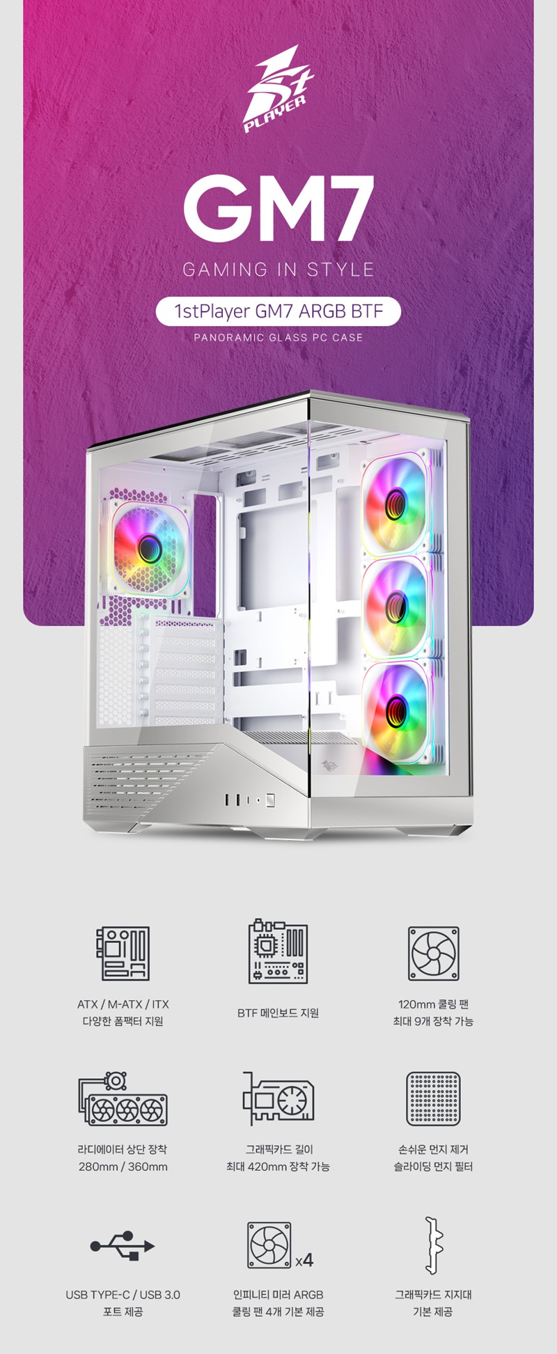 시소닉(Seasonic)·맥스엘리트 파워서플라이, 1stPlayer 케이스, 할른지예(Halnziye) 써멀 컴파운드, 업히얼(upHere) CPU 쿨러 등을 국내시장에 공급하는 맥스엘리트(명재덕·양경훈 공동 대표)는 2025년 11월 5일, 고급형 미드타워 PC 케이스 1stPlayer GM7 ARGB BTF' 케이스를 공식 출시한다고 밝혔다.