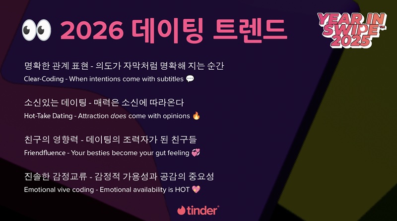 틴더 이용자들 사이에서도 이러한 변화는 뚜렷하게 나타나고 있다. ‘명확한 관계 표현(Clear-Coding)’, ‘소신 있는 데이팅(Hot-Take Dating)’, ‘친구의 영향력(Friendfluence)’, ‘진솔한 감정 교류(Emotional Vibe Coding)’ 등 자신감 기반의 트렌드가 부상하며, 정서적 개방성·진정성·과감함·솔직함이 새로운 매력 요소로 자리 잡았다. 데이팅이 더 이상 ‘오글거리는 순간’의 연속이 아닌, 명확성·연결감·주도권을 기반으로 자신만의 스토리를 만들어가는 과정이 되었다는 분석이다.