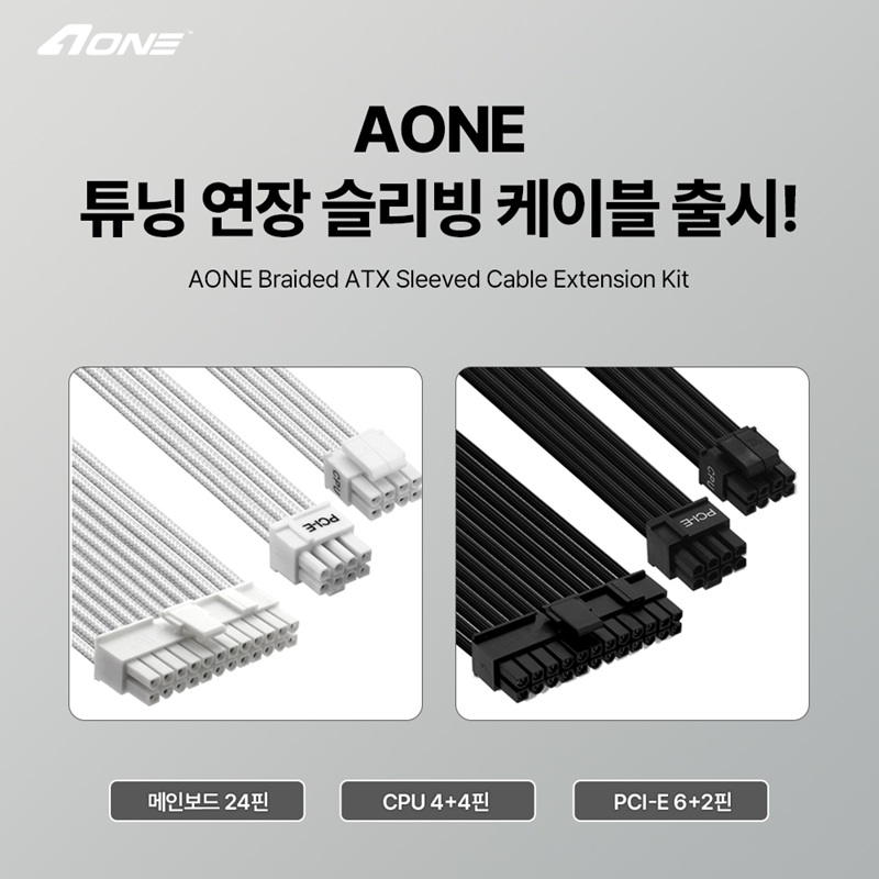 이번에 출시된 AONE 튜닝 연장 슬리빙는 24핀 ATX 케이블(30cm)과 CPU 4+4핀 (30cm), PCI-E 6+2핀(30cm, 2개)으로 구성된다. 두꺼운 16AWG 채용 하여 안정적인 전류 공급과 뛰어난 내구성을 보유했으며, 유연하고 단단한 메쉬소재 를 적용해 외부 충격과 압력으로부터 케이블을 효과적으로 보호 한다.