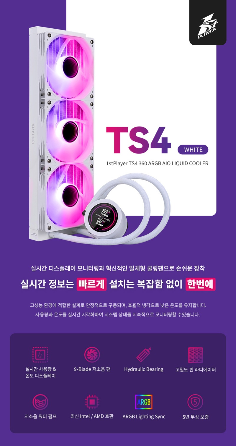 1stPlayer TS4 360 ARGB는 고성능 게이밍 PC 및 하이엔드 시스템 빌드를 위한 차세대 쿨링 솔루션으로 뛰어난 냉각 성능과 사용 편의성을 동시에 제공하는 것이 특징이다. 워터블록 상단에 적용된 정보 디스플레이를 통해 시스템 주요 상태를 직관적으로 확인할 수 있어, 강화유리 기반의 어항형 케이스나 튜닝 케이스 환경에서 시각적 완성도와 실사용 편의성을 모두 만족시킨다.