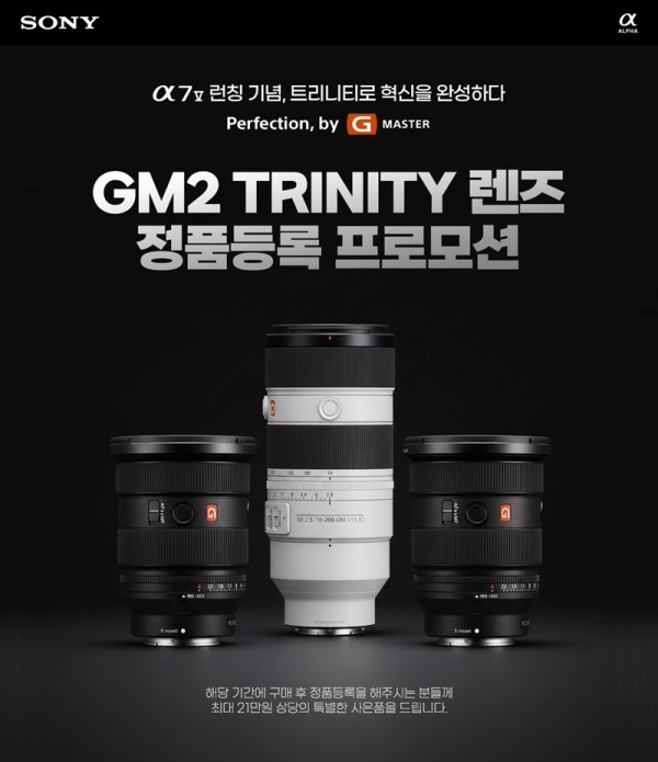 소니코리아가 역대 풀프레임 시리즈 판매량 1위를 기록한 Alpha 7 시리즈의 신규 모델인 ‘Alpha 7 Ⅴ(이하 A7M5)’ 런칭을 기념해 3월 2일(월)까지 GM2 트리니티(Trinity) 렌즈 정품등록 프로모션을 진행한다.