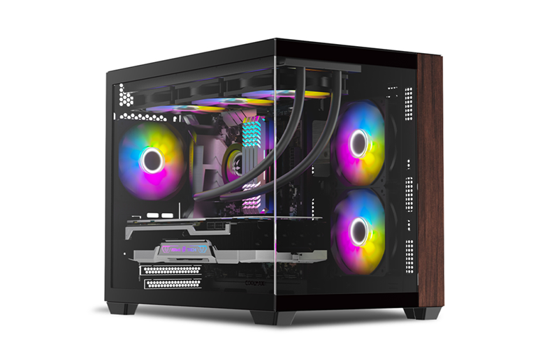 쿨맥스 크리스탈 우디는 기존 쿨맥스 크리스탈의 파노라믹 구조와 쿨링 설계를 유지하면서, 전면 패널에 월넛(Walnut) 목재 패널을 적용한 것이 특징이다. 따뜻한 색감과 자연스러운 나뭇결로 기존 메탈·글래스 중심의 PC 케이스와 차별화된 인테리어 감성을 완성한다.