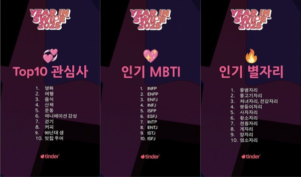 틴더(Tinder)가 최근 발표한 글로벌 연말결산 ‘2025 Year in Swipe™’에 이어, 한국 틴더 이용자 데이터를 기반으로 국내 싱글들의 인기 관심사∙성격 유형∙별자리 트렌드¹를 공개했다.