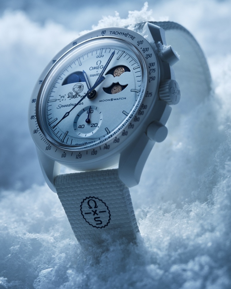 스와치는 지난 8월부터 오메가, 피너츠와 협업해 매월 달을 상징하는 모티브를 담은 바이오세라믹 문스와치(Bioceramic MoonSwatch) ‘미션 투 어스페이즈 – 문샤인 골드’ 시리즈를 선보여 왔다. 달과 지구의 움직임을 시각적으로 표현한 어스페이즈와 문페이즈 디자인을 기반으로, 각 달의 테마를 색상과 디테일로 풀어내는 방식이다. 이번 ‘콜드 문(Cold Moon)’ 모델은 이러한 흐름 속에서 ‘눈(snow)’이라는 계절적 요소를 더해, 겨울의 분위기를 강조한 시즌 해석 버전으로 완성되었다.
