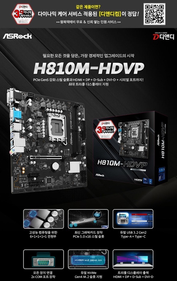 3년 다이나믹케어 서비스를 앞세워 혁신적인 IT 하드웨어 솔루션을 제공하는 디앤디컴(대표: 손권석, 이하 디앤디)에서 AI 시대를 위한 실속형 플랫폼 메인보드 '애즈락 H810M-HDVP'를 국내 시장에 출시한다고 밝혔다.