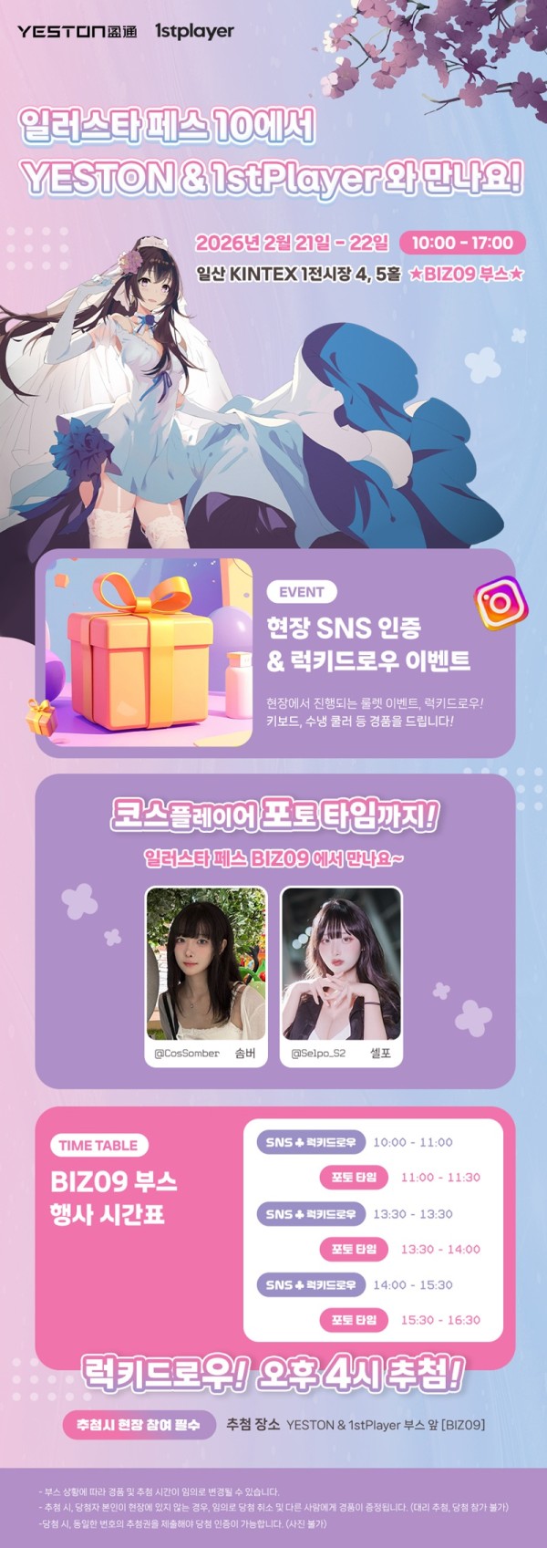 프리미엄 PC 게이밍 컴포넌트 브랜드 1stPlayer는 2026년 2월 21일부터 22일까지, 일산 킨텐스 1전시장 4, 5홀에서 열리는 일러스타 페스 10 행사에 YESTON 브랜드와 협업하여 전시, 이벤트 부스를 오픈한다고 밝혔다. 일러스타 페스 10은 오전 10시부터 오후 5시까지부스 진행되며, 1stPlayer, YESTON 콜라보 부스는 ‘BIZ09’ 에 위치한다.