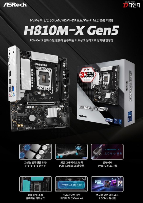 3년 다이나믹케어 서비스를 앞세워 혁신적인 IT 하드웨어 솔루션을 제공하는 디앤디컴(대표: 손권석, 이하 디앤디)에서 차세대 그래픽카드 시대를 위한 실속형 플랫폼 '애즈락 H810M-X Gen5'를 출시했다고 밝혔다.