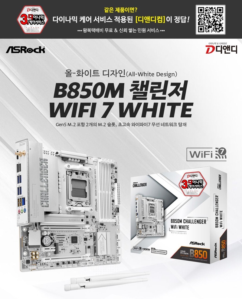 3년 다이나믹케어 서비스를 앞세워 혁신적인 IT 하드웨어 솔루션을 제공하는 디앤디컴(대표: 손권석, 이하 디앤디)에서 AMD AM5 소켓 기반의 애즈락 B850M 챌린저 WIFI 7 WHITE 메인보드를 국내에 공식 출시했다고 밝혔다. 이 제품은 강력한 게이밍 성능과 최신 연결성, 그리고 사용자 친화적인 기능들을 고루 갖춘 것이 특징이다.