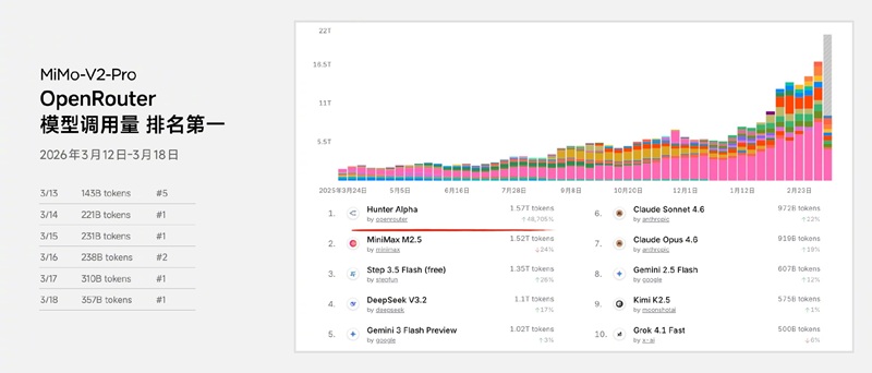 샤오미는 지난주 OpenRouter에 차세대 모델 MiMo-V2-Pro를 익명으로 공개했으며, 공개 직후 빠르게 일간 1위를 기록한 데 이어 현재 주간 1위에 올라섰다.