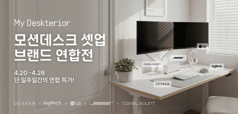 또한 데스커를 중심으로 LG, 카멜마운트, 보스, 로지텍 등 IT 및 데스크 환경 관련 대표 브랜드가 참여한다. 소비자들은 하나의 프로모션 안에서 모니터, 스피커, 주변기기 등 데스크셋업에 필요한 다양한 제품을 함께 고려할 수 있어 보다 완성도 높은 홈오피스 환경을 구축할 수 있다.