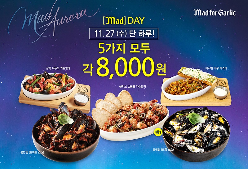 11월 매드데이에는 갈릭과 와인으로 특화된 매드포갈릭만의 스페셜 레시피를 더한 5종의 메뉴가 단 8,000원에 제공될 예정이다. 먼저, 신선한 홍합을 듬뿍 넣고 새콤한 토마토 소스로 감칠맛을 살린 ▲홍합찜(토마토 소스), 홍합에 크림소스를 더해 한층 부드러운 맛을 더한 ▲홍합찜(크림소스)이 있다. 홍합찜을 주문하는 고객에게는 전용 사이드 메뉴로 함께 즐기기 좋은 브레드 4조각과 갈릭 버터 라이스를 부담 없는 가격으로 제공한다. 또한, 다양한 해산물이 풍부하게 들어가 고객들에게 잊지 못할 바다의 맛을 선사하는 ▲갈릭 씨푸드 카슈엘라, 특제 라구소스와 마팔디네면 위에 부드러운 핸드메이드 베샤멜 소스를 더한 ▲베샤멜 라구 파스타, 갈릭과 올리브를 듬뿍 넣은 지중해풍 소스에 새우를 껍질째 매콤하게 조리한 ▲올리브 슈림프 카슈엘라가 제공된다. ‘홍합찜(크림소스)'과 '갈릭 씨푸드 카슈엘라'는 오직 매드데이에만 즐길 수 있는 한정 메뉴로, 매장 상황에 따라 조기 품절될 수 있다.