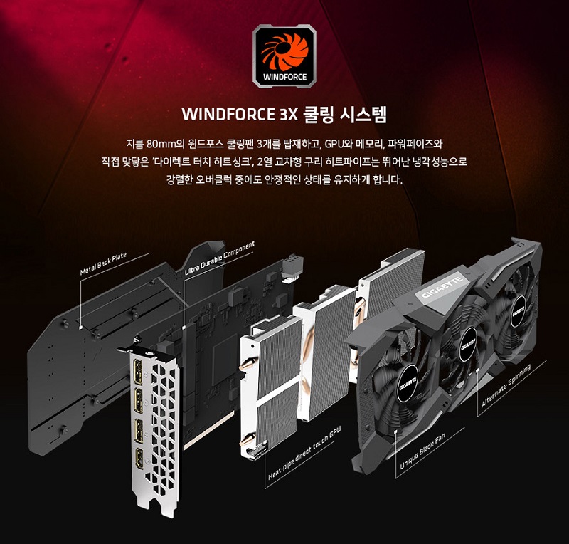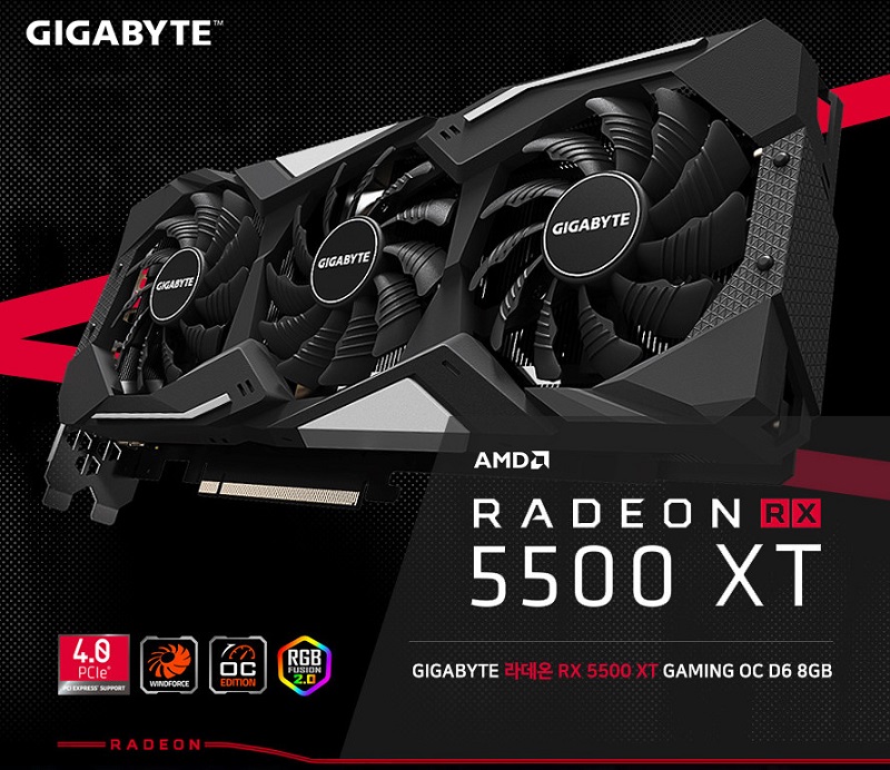 이 중 최상위 모델인 기가바이트 라데온 RX5500 XT Gaming OC D6 8GB 는 앞서 설명된 AMD 라데온 최신 기술력의 결정체인 RDNA 아키텍처 그래픽코어(최대 부스트 1845MHz)를 탑재하고, 고대역의 GDDR6 메모리(128bit, 14,000MHz)와 함께 그래픽카드에서는 최초로 PCIE 4.0 X16 인터페이스를 지원한다. 또한 직경 80mm 윈드포스 트리플 쿨링팬과 2열교차형 히트파이프, 7페이즈 전원부를 통해 강력함과 매우 효율적인 냉각성능, 안정적인 전력공급까지 보장한다.(이상 Gaming OC 기준)