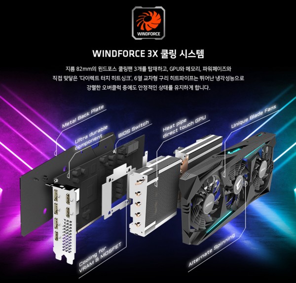 이 제품은 앞서 설명된 AMD 라데온 최신 기술력의 결정체인 RDNA 아키텍처 그래픽코어(최대 부스트 2010MHz)를 탑재하고, 고대역의 GDDR6 메모리(256bit, 14,000MHz)와 함께 그래픽카드에서는 최초로 PCIE 4.0 X16 인터페이스를 지원한다. 또한 직경 82mm 윈드포스 트리플 쿨링팬과 6열교차형 히트파이프, 9페이즈 전원부를 통해 강력함과 매우 효율적인 냉각성능, 안정적인 전력공급까지 보장한다.