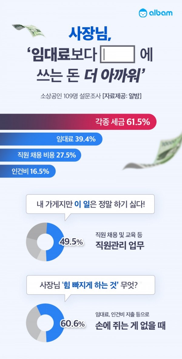 그 결과, 사장님들은 임대료보다 세금으로 지출하는 비용을 더 아까워하고, 직원 관리하는 일을 가장 힘들어하는 것으로 밝혀졌다.