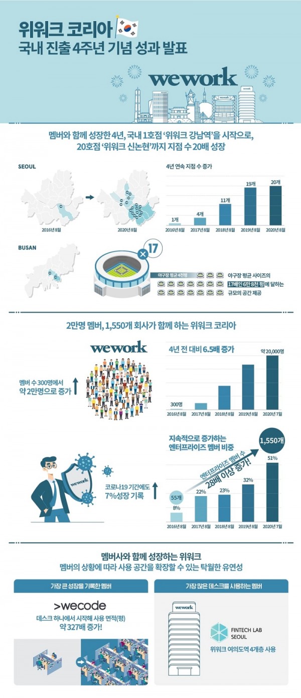 위워크는 지난 2016년 8월 국내 1호점 ‘위워크 강남역’ 오픈 이래, 서울과 부산에서 총면적 6만 8천 평에 달하는 독보적인 규모의 공간을 제공해왔다. 2020년 2분기 기준, 위워크 멤버 수는 4년 전 대비 65배 증가한 약 20,000여 명이며, 그중에서도 엔터프라이즈 멤버 비율은 6배, 엔터프라이즈 멤버 수는 28배 이상 증가했다. 특히 엔터프라이즈 부문에서 이루어낸 성과는 업계 실적을 측정하는 가장 높은 지표로, 위워크의 독보적인 대규모 공간 및 유연함을 바탕으로 한 서비스 경쟁력과 리더십을 입증한다.
